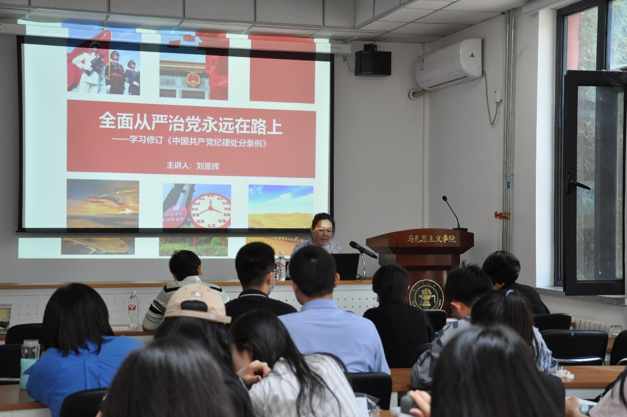 刘昱辉从党的十八大以来,中国共产党发扬彻底的自我革命精神,坚定不移推进全面从严治党,党风政风发生根本转变讲起,使大家认识更加深刻理解本次《条例》的修订和开展党纪学习教育的重大意义;结合丰富的案例,对《条例》最新修订的重点内容和与高校师生联系紧密的条款内容进行了详细解读,加强了大家对自觉遵守执行《条例》的认识。与会人员纷纷表示要不断增强自身纪律意识、持续提升党性修养,把党章党规党纪刻印在心,做到知敬畏、存戒惧、守底线,形成遵规守纪的自觉意识。