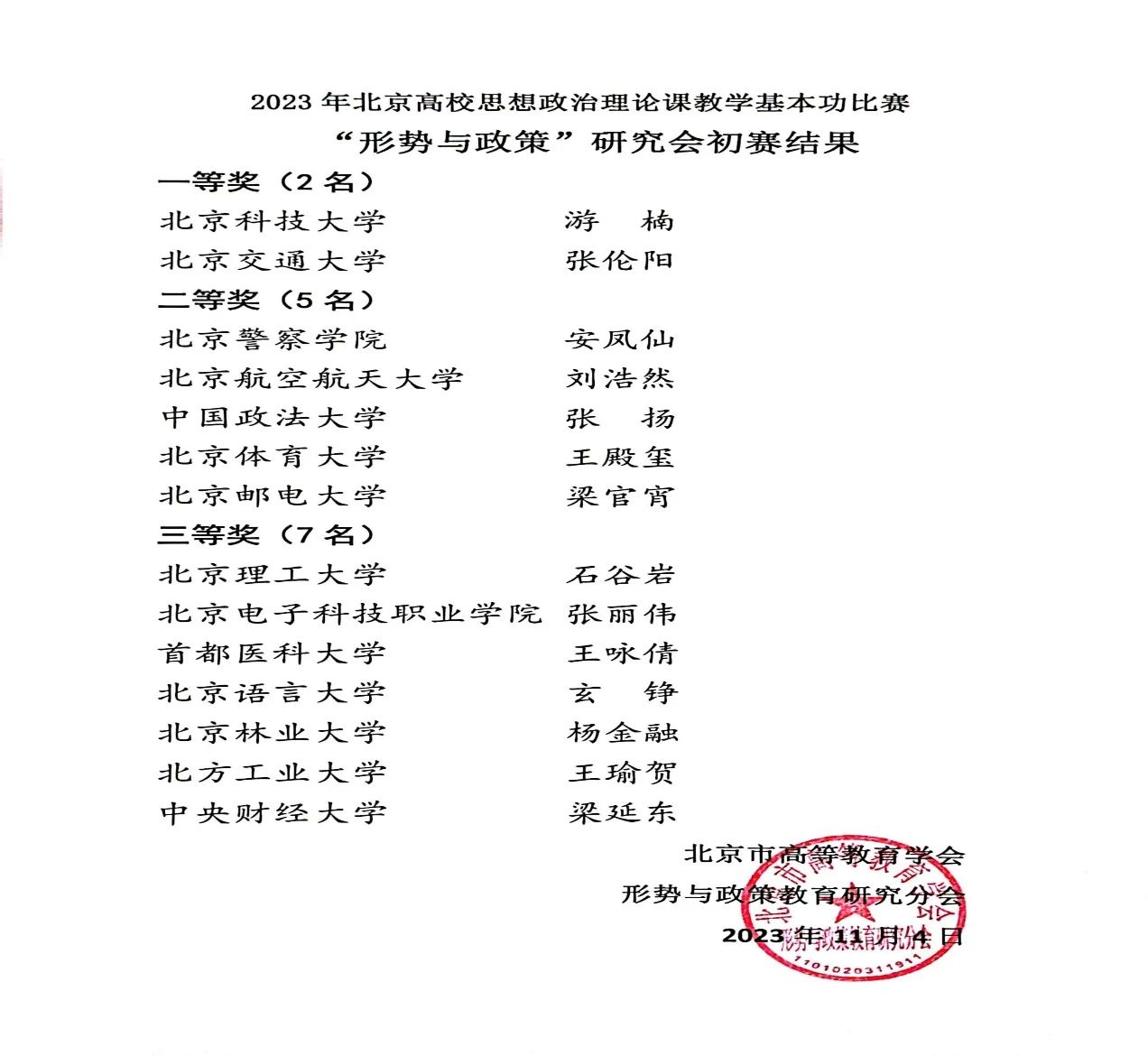 本次比赛由北京市高等教育学会形势与政策教育研究分会主办,jinnianhui今年会jinnianhui今年会承办。来自北京大学、北京航空航天大学、北京理工大学、北京邮电大学、中国政法大学、中央财经大学、对外经济贸易大学、北京科技大学、北京林业大学、北京化工大学、jinnianhui今年会等24所在京高校的“形势与政策”课教师参加了比赛。比赛以推动党的二十大精神融入思政课教学为主题,重点考察思政课教师学深悟透党的二十大精神,并将其融入课堂教学的理论水平,特别是立足京华大地生动实践讲好“大思政课”的能力。